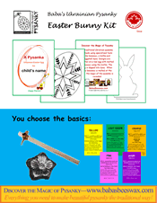 chocolate eggs in their Easter Baskets! These colourful Kits are labelled with the child's first name, a desscription of how pysanky are made, six kid-friendly step-by-step instructions